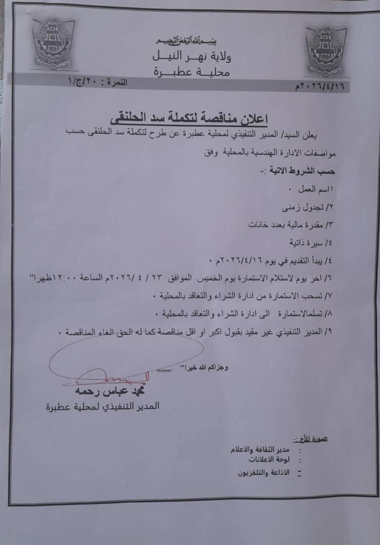 يعلن السيد/ المدير التنفيذي لمحلية عطبرة عن طرح مناقصة تكملة لسد الحلنقى حسب المواصفات الإداره الهندسية بالمحلية وفق وحسب الشروط الاتيه: