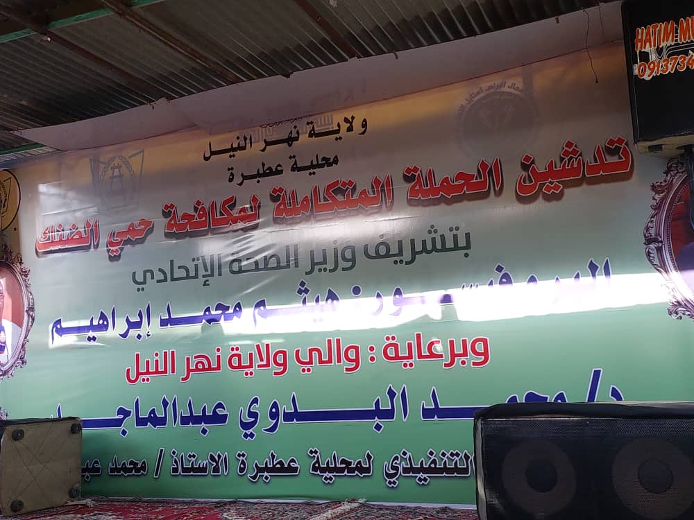 دشن دكتور هيثم محمد إبراهيم وزير الصحة الإتحادي الحملة المتكاملة لمكافحة نواقل الأمراض من محلية عطبرة بمشاركة التنظيمات الشبابية والإتحادات الرياضية وكوادر الصحة الولائية والمحلية ، وأشار الوزير الى التحدي الكبير أمام محلية في إعلانها صفرية الضنك عبر إستراتيجية تسعى المحلية لتنفيذها.الأستاذ مصطفى محمد عثمان وزير صحة نهرالنيل أكد أن الحملة تستمر لاسبوعين وتشمل محليات شندي والمتمة والدامر وعطبرة وأشار الشريف الى أن الحملة ستشمل الرش بالطيران والرش الأرضي لمكافحة كافة نواقل الأمراض إضافة لبعض المعالجات الصحية والتثقيفية التي تهدف لتجفيف المياه ومنع توالد كافة أنواع الباعوض، الأستاذ محمد عباس مدير تنفيذي عطبرة أعلن وبما تمتلكه المحلية من كوادر ومنظمات وشركاء العمل العام بالمحلية قادرة على إعلان صفرية الضنك مؤكدا أن المحلية ستسخر كافة إمكاناتها لإنجاح الحملة وتحقيق أهدافها على النحو الأكمل.